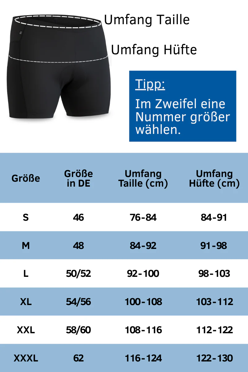 Auf der Produktseite unserer KOMFORO™ Radunterhose findest du eine detaillierte Größentabelle. Miss deinen Hüftumfang und vergleiche mit der Tabelle. Falls du zwischen zwei Größen liegst, empfehlen wir die größere Variante für mehr Komfort.