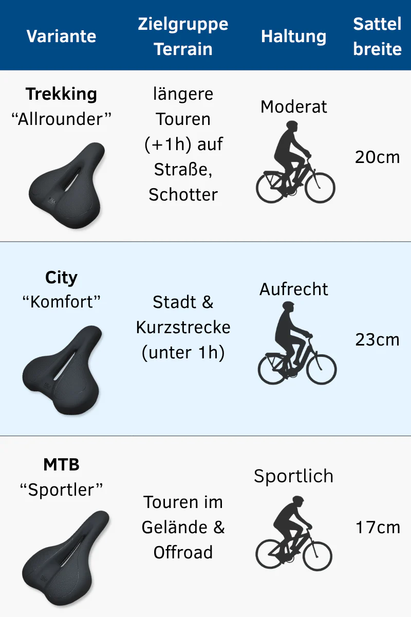 Unser KOMFORO™ Fahrradsattel ist ergonomisch geformt und passt auf alle gängigen E-Bikes und Fahrräder mit Standard-Sattelstütze. Er ist besonders Ideal für Trekking-, City- und MTB -E-Bikes, die mehr Komfort suchen. Auf der Produktseite findest du detaillierte Infos zu Maßen und Passform.